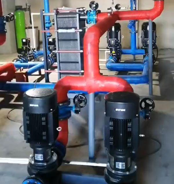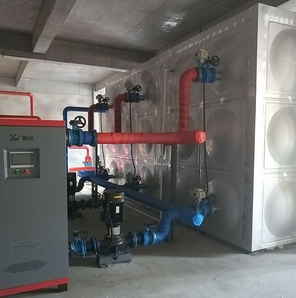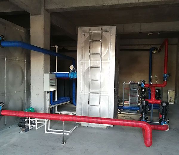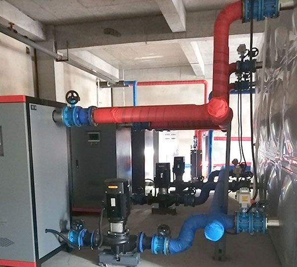 采用总功率:1200KW 储能式控制机组(3台400KW),配合132m³的蓄热水箱。每晚利用谷电时段 进行储能加热,供暖效果良好。